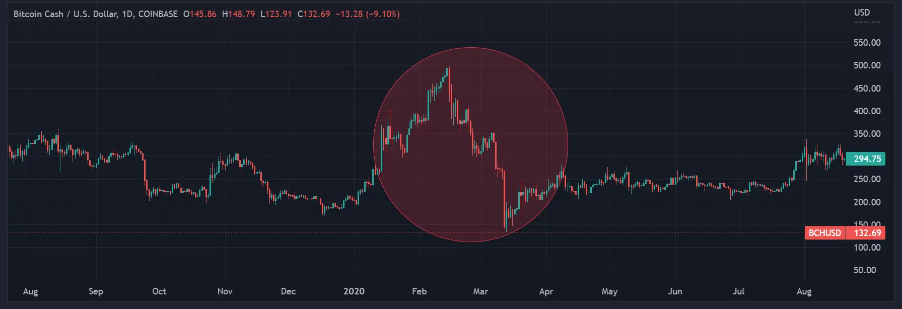 By February 2020, BCH was trading close to $500. Around the same time, all the global markets crashed due to the pandemic-induced worldwide lockdowns. The Bitcoin Cash price also crashed in March 2020 and dipped to $133.6. This showed that the Bitcoin Cash price was susceptible to global economic uncertainty like any other asset. In the 3rd quarter of 2020, the equities and traditional markets started booming again, and the BCH price followed suit.