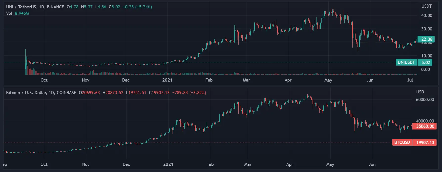 By May 2021, BTC was trading around $60,000 after reaching a high of $65,000 in April. This was when a sudden Bitcoin crash jolted the entire digital asset market. The massive sell-off sent Bitcoin prices below $29,000 in June 2021. The Uniswap price also took an enormous hit and plummeted to $14 in July 2021, demonstrating that the Uniswap price was tied to Bitcoin’s price action, just like all other altcoins.